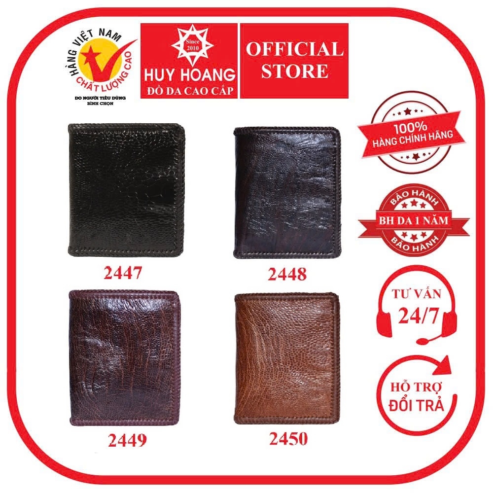 - Ví nam da thật Huy Hoàng làm bằng chất liệu da đà điểu thật, kiểu dáng lạ mắt, sang trọng. Thiết kế nhỏ gọn, thời trang, tỉ mỉ và trau chuốt từng bộ phận từ dây kéo chắc chắn, tiện dụng, dạng ví xếp gấp, có nhiều ngăn tiện lợi chứa giấy tờ tùy thân, các loại thẻ... phụ kiện không thể thiếu cho phái mạnh